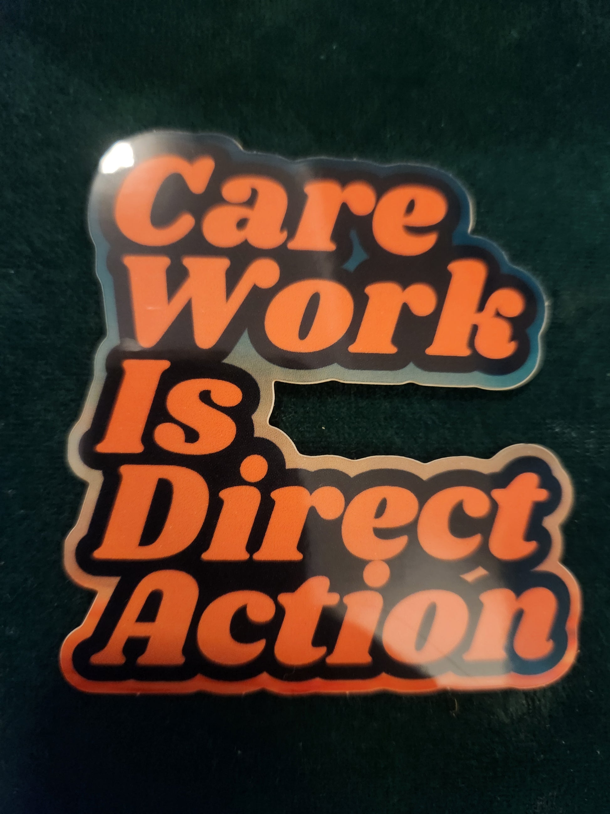 Dye cut sticker. The words are care work is direct action. The words are orange with blue tracing around and the background is a horizon