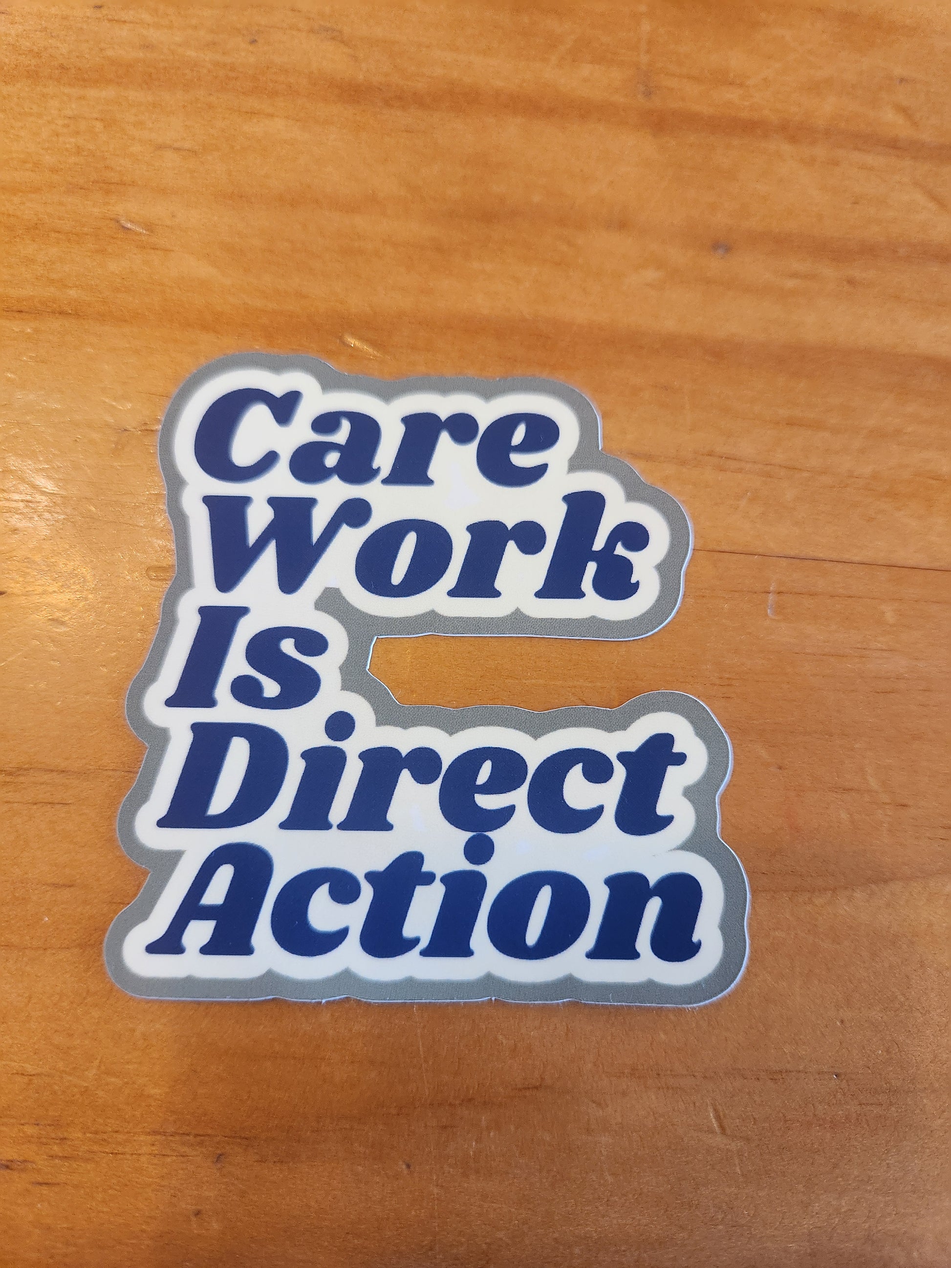 Dye cut sticker. The words are care work is direct action. The background is olive green. The words are navy blue with beige tracing around.