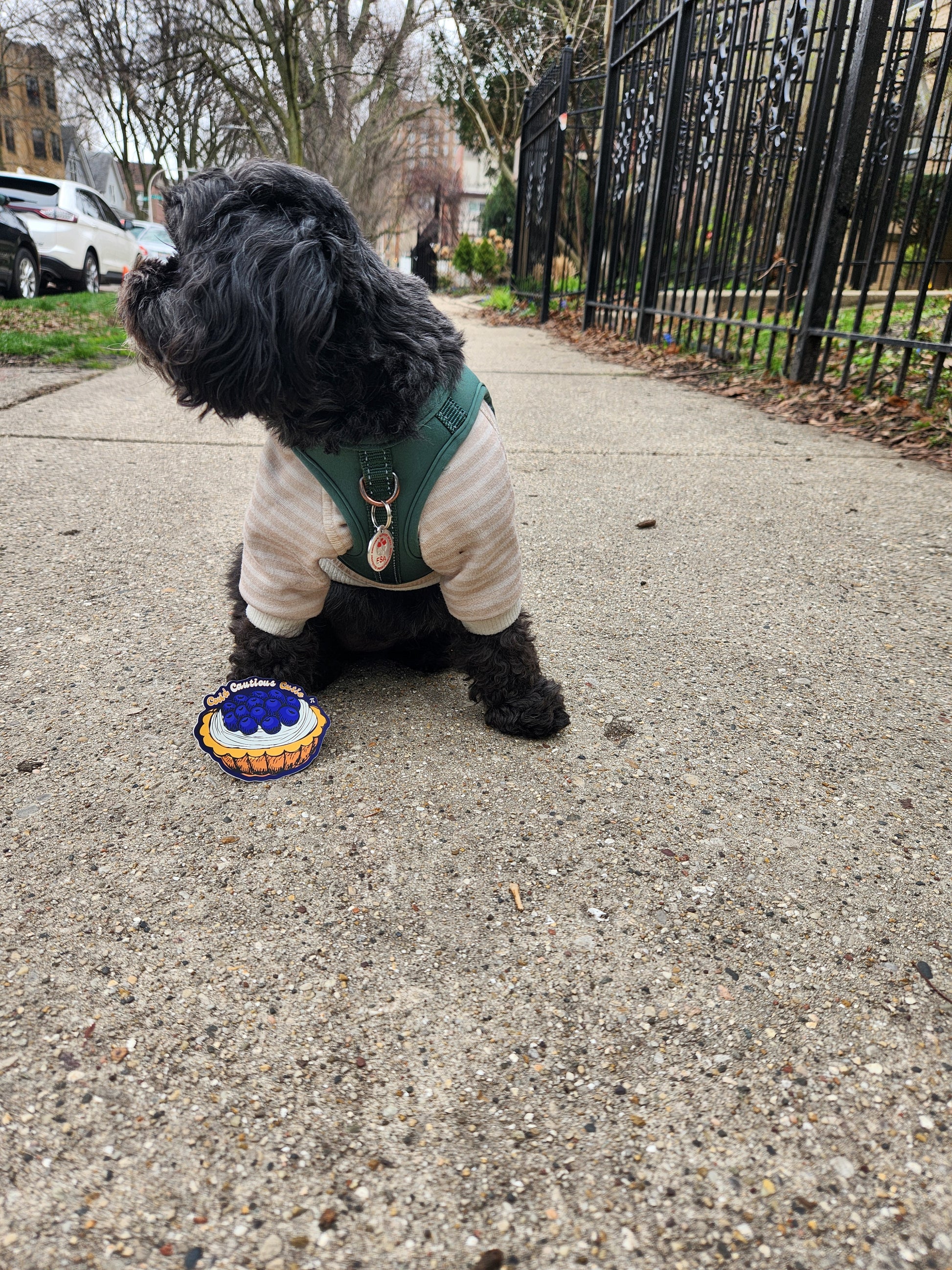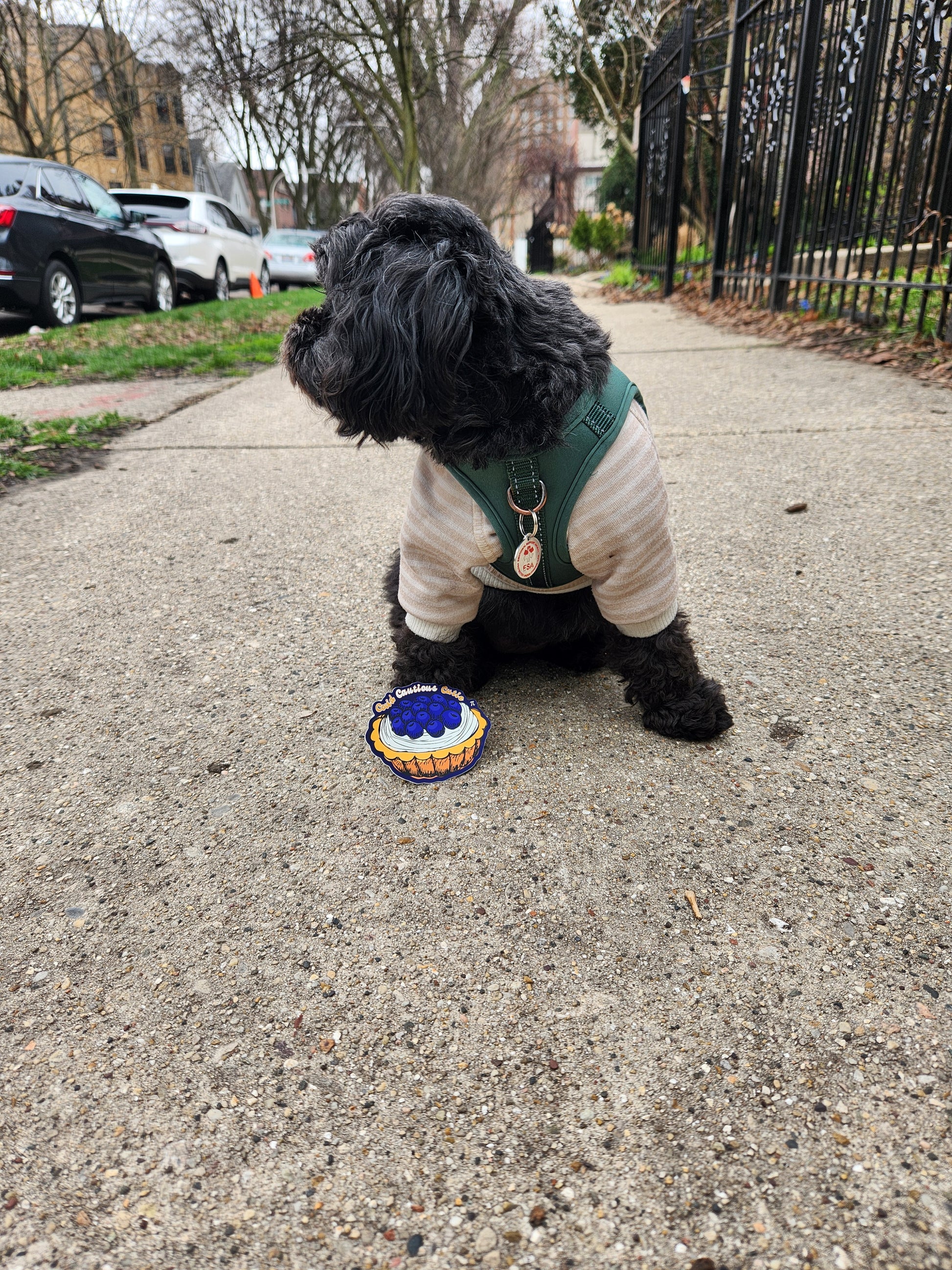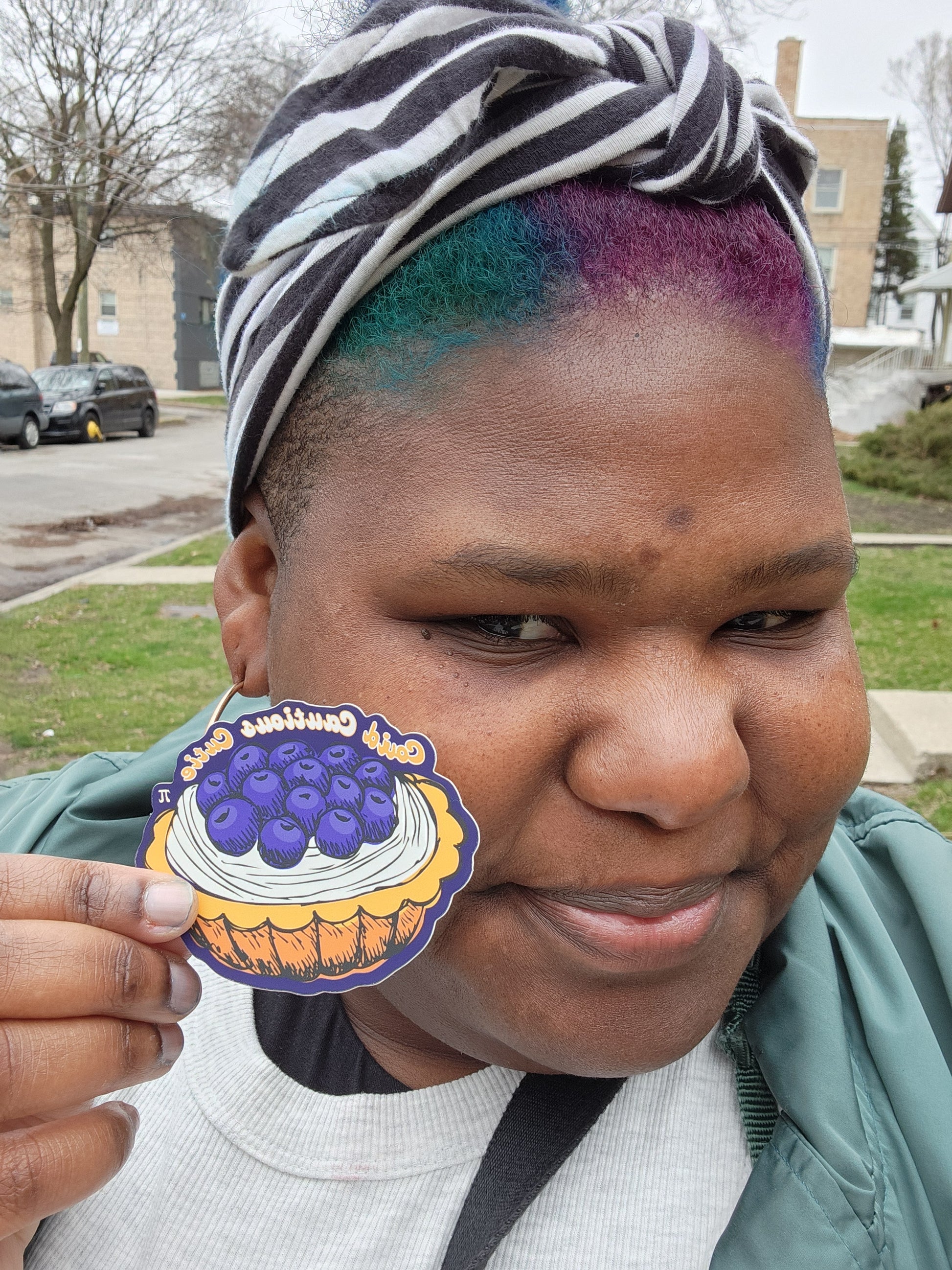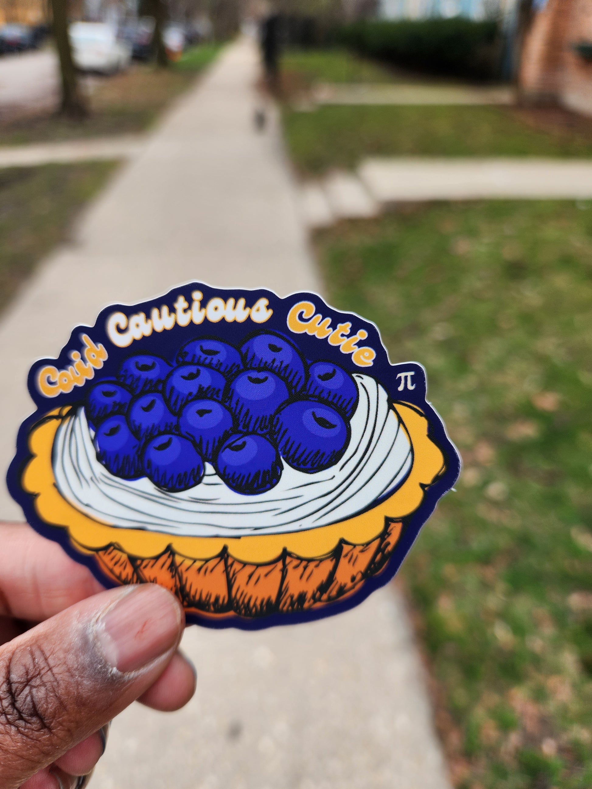 A sticker that is shaped like a blueberry pie. The background is blue. In yellow and white words it says "Covid cautious cutie pie"