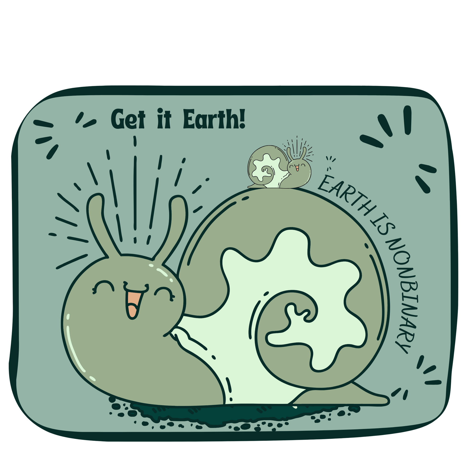 A blue rectangular sticker with a big snail and a super tiny snail on it that says Earth is Nonbinary in dark blue in the top left and "get it earth" along the side of the big snail on the right. Both snails are light green and very light blue patterned. They are smiling and you can see their red mouths. There are small dark blue lines around the snails to give the illusion of emphasizing their joy.