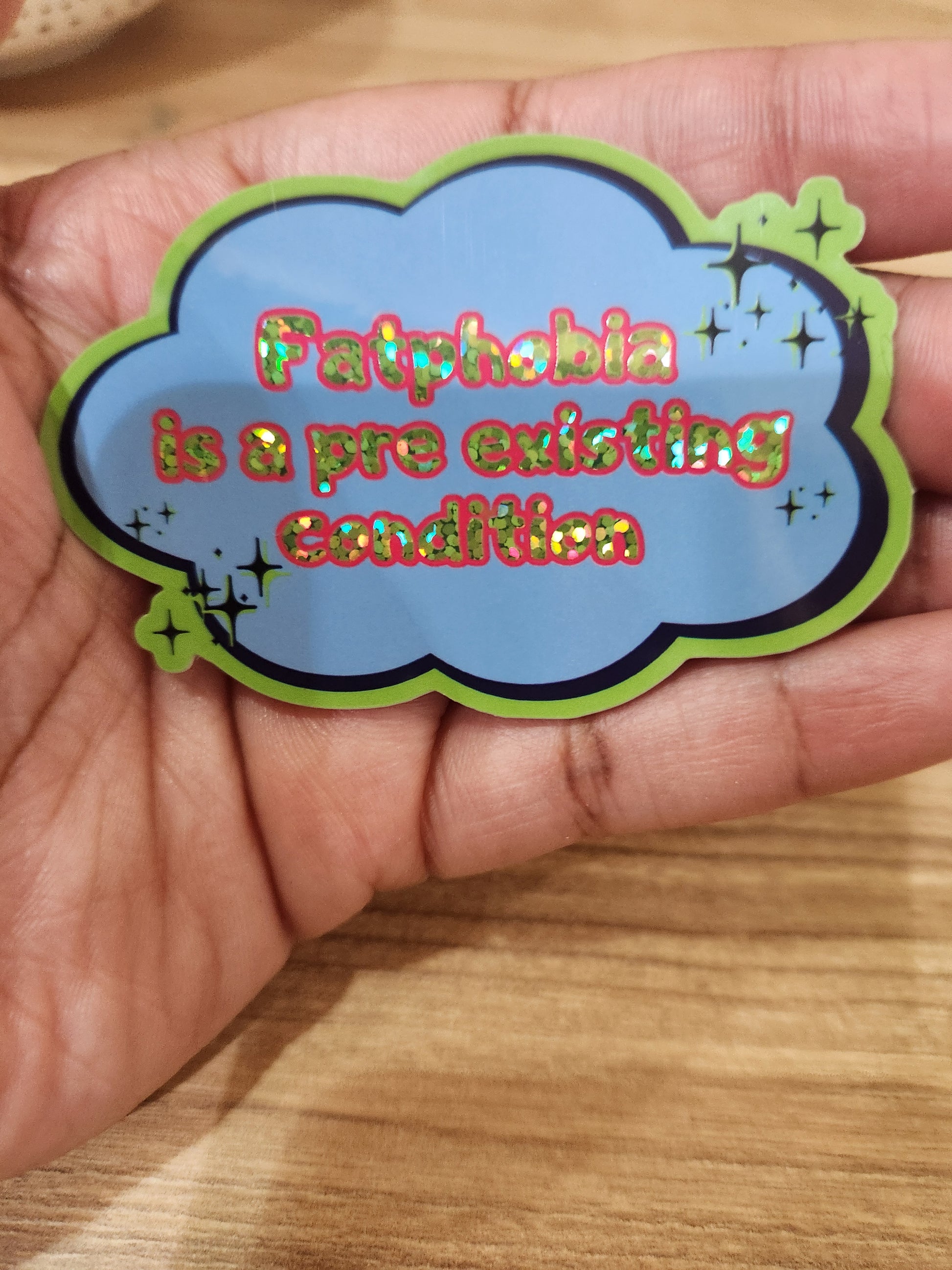 Image Description: A oval stickers that's lime grean, then blue, then pink. Glittery text outlined in black that reads: "fatphobia is a preexisting condition: