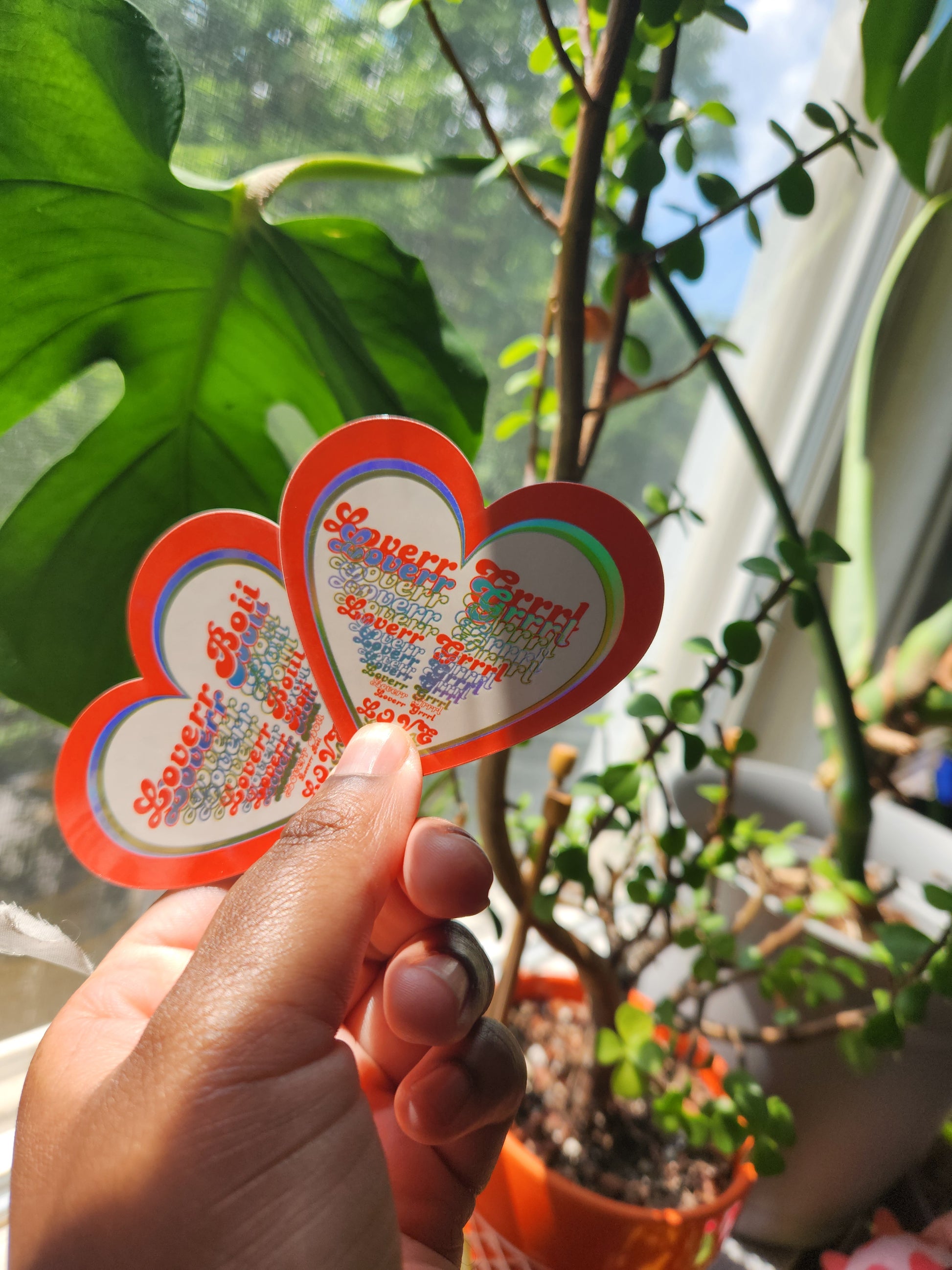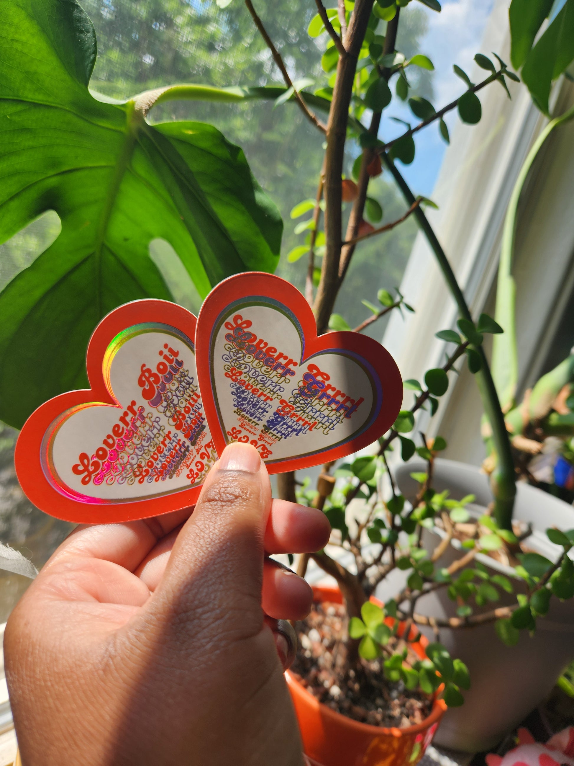 A heart shape sticker that is beige then green then lavender then red. In the center is the words "Lover Boiii" over an over. Its vinyl and holographic